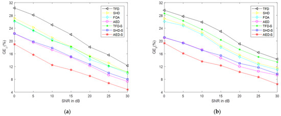GE for estimation with the threshold . (a) is the GE against . (b) is the GE against SNR.