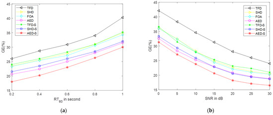 The relationships between the results and the parameters are shown in Figure 7, Figure 8 and Figure 9. From Table 3, Table 4, it can be known that the SH-MUSIC method and the DPD-MUSIC algorithm perform worse than the deep learning methods. Thus, these two methods are removed from the experiments for exploring the relationship between results and influencing factors. The relationship between the results and is given in Figure 7 with the threshold . Figure 7a shows the GE for azimuth against , Figure 7b shows the GE for elevation against Figure 8 shows the relationship between the results and SNR with the threshold . Figure 8a shows the GE for azimuth against SNR, and Figure 8b shows the GE for elevation against SNR. Figure 9 indicates the relationship between the results and parameters, which is given in with the threshold . Figure 9a shows the GE against , and Figure 9b shows the GE against SNR.