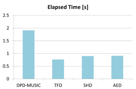 The elapsed time comparison among the algorithms for the test stage is shown in this section. The elapsed time is calculated from acquiring the feature to obtaining the DOA. For a fair comparison, all the experiments are conducted in the same system with Core (TM) i5-4800S processor manufactured by Inter (R), RAM of 16 GB, 64-bit instruction set. A clock speed of 2.81 GHz is used for execution. Figure 10 shows the elapsed time comparison in the form of a bar chart. It can be observed that the computational complexity is reduced. From the results of the bar chart and theoretical analysis, it can be known that the proposed method reduces the computational complexity