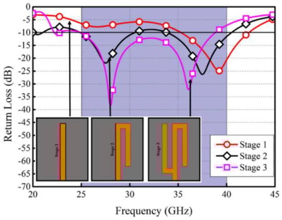 In stage 1, a simple l-shape resonator was introduced that showed the resonance response from 36 to 42 GHz with central frequency of 39 GHz. This was further modified with the insertion of an inverted L-shape stub on the right hand side of the l-shape strip. The stub enhanced the bandwidth response to dual-band characteristics, which in stage 3 was modified to a wide bandwidth with the insertion of L-shape stub on left side of the resonating structure.