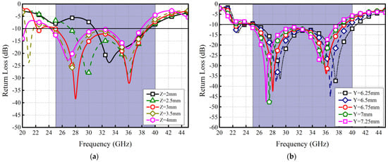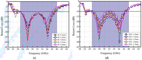 The proposed MIMO antenna has been evolved in number of parametric steps. Parametrical studies are conducted to see the antenna’s resonance response by altering different paths of currents. Figure 3 shows the wideband response achieved through different parametrical studies conducted. The parameters optimized were Z, Y, K and XX. At the start, parameter Z was parametrically optimized. The starting value was kept at 2 mm and was analyzed up to 4 mm. Five different values in this range were analyzed, each with a difference of 0.5 mm. It was observed that with every increment in value, the design response changed rapidly. It was observed that the resonance value increases with every increment in parameter Z. At 2 mm, a resonance of nearly 7 GHz was achieved from 31 to 38 GHz. At 2.5 mm, the resonance starts at 27 GHz and ends at 38 GHz, giving an approximately 11 GHz bandwidth. The optimal response was achieved at 3 mm, from 25 to 39 GHz. After this optimum value, any further increase resulted in effecting the resonance response. From Figure 3a, it can be seen that the resonances become abrupt. Similarly, in Figure 3b, parameter Y, which is feed length, was analyzed with five samples from 6.25 to 7.25 mm. The optimum response was achieved at 6.25 mm. With further increases in length, the resonance response shifted backwards. The K parameter in Figure 3c showed the optimal response at 3.5 mm. Any further increases and decreases showed that although the resonance bandwidth remains uncertain, the reflection co-efficient value becomes abrupt. The trunked ground-plane square slot was optimized from 1.3 to 1.7 mm. The length and width of the square slot was kept same, and Figure 3d shows resonance behavior with antenna parameter XX. Figure 4 shows the single-element radiation patterns and gain over frequency. The gain ranges between 3.9 and 5.2 and efficiency ranges between 85 and 98%.