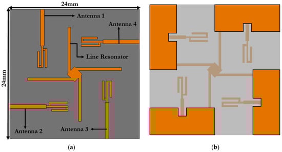 Figure 7 shows the isolation of the proposed antenna with and without the isolating structure. It can clearly be seen that with the insertion of a line resonator at the center, the resonator acts as a decoupling structure for MIMO antennas as the line resonator effectively cancels the constructive interference of currents among radiating elements, and thus the isolation levels are improved.