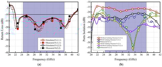 Simulated and Measured S-Parameters. (a) Return loss (b) Ports Isolation.