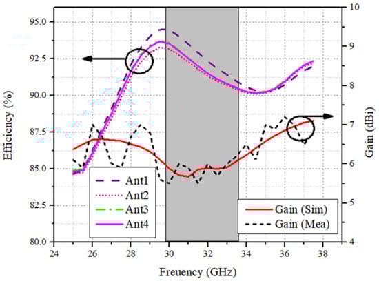 Figure 9 shows the antenna efficiency and simulated and measured gain of the proposed MIMO system. The efficiency of the MIMO antenna ranges in between 85% and 94%, while at 28 GHz, the efficiency is found to be almost 92 to 92.5% for all radiating elements. The range of the antenna gain is found to be 5.9 to 7 dB.