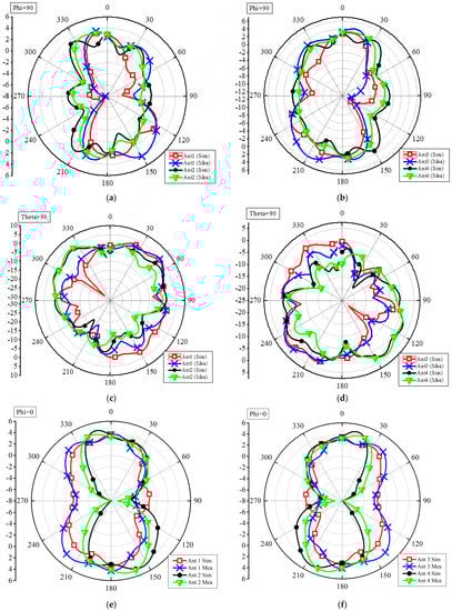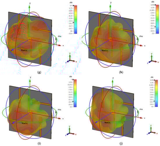 Radiation Patterns (a) 2D antenna 1 and antenna 2 Phi90 (b) 2D antenna 3 and antenna 4 Phi90 (c) 2D antenna 1 and antenna 2 Theta 90 (d) 2D antenna 3 and antenna 4 Theta90 (e) 2D antenna 1 and antenna 2 Phi0 (f) 2D antenna 3 and antenna 4 Phi0 (g) 3D antenna 1 (h) 3D antenna 2 (i) 3D antenna 3 (j) 3D antenna 4.