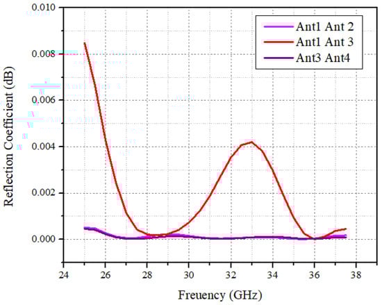 Furthermore, the simulated and measured S-parameters are show, in Figure 8. The reflection co-efficient in Figure 8a shows the resonance from 22 to 40 GHz, while the isolation value of antenna 1 and antenna 3 is found to be in between −15 dB and −19 dB without the presence of decoupling structure. The lowest isolation without decoupling structure is found to be −19 dB at 29 GHz frequency. As with the insertion of decoupling structure, the isolation value improved from −22 dB to −27 dB. The isolation value with decoupling structure showed improvement up to 5 dB for antenna 1 and antenna 3. The isolation value between adjacent radiating elements, antenna 1 and antenna 2 was also improved. The measured results achieved after measurements are shown to be in excellent agreement with the simulations. A few minor alterations can be seen but can be attributed to errors during measurement set up.