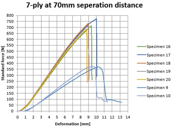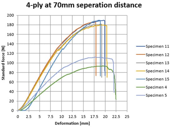 Test samples for Zwick Z010 machine were prepared by slicing composite material into suitable sample sizes of 300 × 300 mm, after the curing. Each sample was put through a three-point flexural test. It was determined that varying the separation distance would offer the best test criteria for comparing batches, while varying the strain rate would allow an examination of how stiffness vary with strain rate. Figure 2 and Figure 3 show the results of each test, which were completed till failure. For the 4-ply samples, the graph of force against deformation is shown in Figure 3. For the 7-ply samples, Figure 3 exhibits the same results. Table 1 and Table 2 contain the specimen number, number of plies, manufacturing technique, speed of force, and other data needed to identify the precise test parameters for individual specimens in Figure 2 and Figure 3 [].