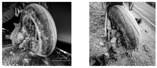 A handwritten report of a CF motorcycle wheel failure describes a potential fatal near miss when a high-power aftermarket motorcycle wheel failed. The wheel manufacturer, a relatively new producer of such products reportedly handled the reporting of the event with extreme satisfaction and the user held no responsibility to the product itself. The high-performance wheels are designed and destined for the track; in this case they were used for street rides upward of 20,000 km over 5 years on an 80 ft/lbs high powered motorcycle on weathered mountain passes. The images of the failure are seen in Figure 5.
