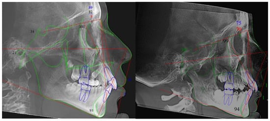 Cephalometric images rendered from CBCT DICOM data and traced using Dolphin Imaging. The (left) is a patient from the control group and the (right) is a patient from the JIA group.