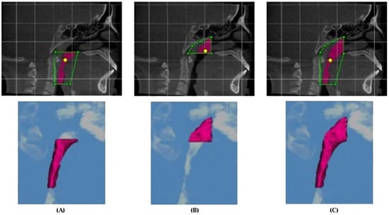 Showing boundaries of airway segmentation performed in Dolphin Imaging for (A) oropharynx, (B) nasopharynx, and (C) total upper airway.