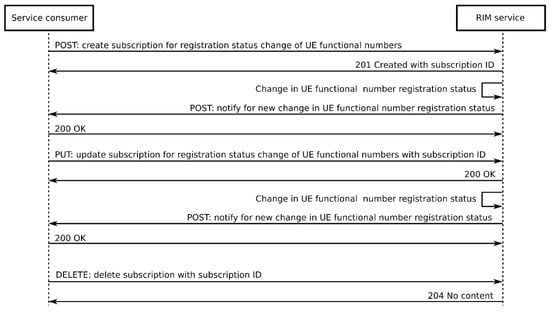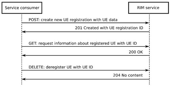 Figure 6 shows a scenario in which a new ueID resource is created, where information about individually registered UE is retrieved, and where UE is deregistered using an application. To register a new UE, an application creates a new ueID resource under http://{apiRoot}/rim/v1/userEquipments. To retrieve information about a registered UE, to update information, or to deregister a UE, an application sends a request under http://{apiRoot}/rim/v1/userEquipments/{ueID}.