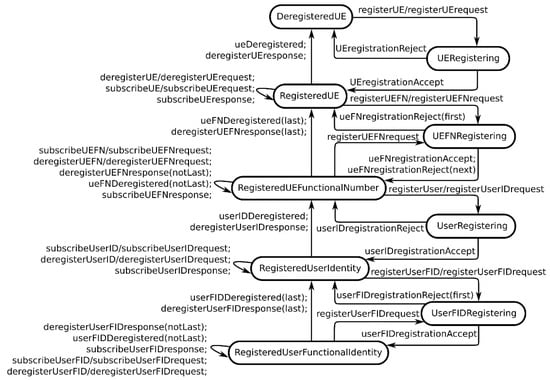 Sapp = {DeregisteredUE [s1a], UERegistering [s2a], RegisteredUE [s3a], UEFNRegistering [s4a], RegisteredUEFunctionalNumber [s5a], UserRegistering [s6a], RegisteredUserIdentity [s7a], UserFIDRegistering [s8a], RegisteredUserFunctionalIdentity [s9a]},