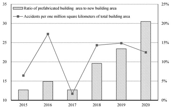 Prefabrication is an industrialized built process that involves a certain amount of building components manufactured in specialized facilities, transported to construction sites, and assembled at designated locations [3]. More than shortening construction duration [4], prefabricated construction is highly praised and increasingly advocated for its inherent benefits of reducing lifecycle cost [5], increasing production efficiency [6], and enhancing environmental performance [7]. Under the promotion of national policies, the scale of China’s prefabricated construction market has gradually expanded, and a total of 630 million square meters of prefabricated buildings were built in 2020 in China, accounting for 20.5% of the newly constructed building area. However, along with the increasing proportion of prefabricated buildings in China, the improvement in safety performance is limited. There is an unapparent indication supporting a decline in accident incidence rate, which is illustrated in Figure 1. Meanwhile, similar evidence could also be found in the USA, where the Bureau of Labor Statistics reported that workers in prefabricated building projects are exposed to higher rates of injuries and accidents (10.2 per 100 workers) than the rates (5.2 per 100 workers) in the traditional cast-in-place construction projects [8]. Not only are these results contrary to the conception that prefabricated construction is comparatively safe to some extent, but they also raise doubts about the general perception of safety concerning prefabricated building projects.