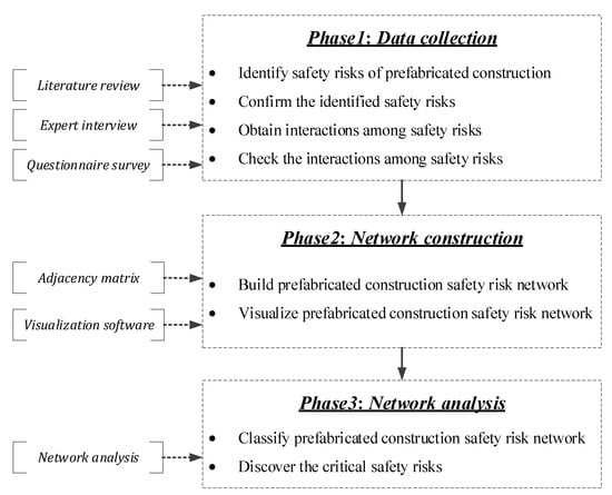 A research framework including three phases is proposed for understanding the safety performance of prefabricated construction, as displayed in Figure 2. The research framework starts with the first phase in which safety risks of prefabricated construction and risk interactions are collected by literature review, expert interview, and questionnaire survey. Integrating the safety risks and risk interactions into the adjacency matrix, and importing it into the visualization software, the next phase would be shaping prefabricated construction safety risk network. In the final phase, the overall characteristics of prefabricated construction safety risk network are explored and the critical risks are discovered.