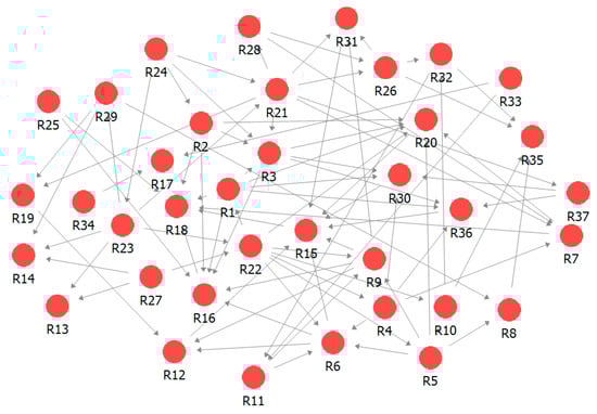 According to the interaction results of risks obtained from the questionnaire stage, the adjacency matrix (A) necessary for constructing the network is formed, as shown in Table 5. On the base of the adjacency matrix, prefabricated construction safety risks and interactions among them can be abstracted into a directed network model, including information of node set (V) and edge set (E), which is defined as G (V, E). In consequence, PCSRN will be an un-weighted directed network composing V node set of 37 nodes and E edge set of 90 edges.