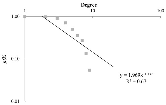 Given the small scale of the established PCSRN, the degree of nodes takes on heavy tail distribution and the statistical characteristics are not obvious, so it is reasonable to measure the cumulative degree distribution function. Similar to degree distribution of scale-free network, the cumulative degree distribution satisfies the power-law distribution with exponent γcum, which can be written as . The curve fitting of the cumulative distribution of node degree in PCSRN is depicted in Figure 5. From this double logarithmic chart, it is apparent that the curve decays according to a power-law distribution which has the approximate fit with γcum = 1.137 (R2 = 0.67), and consequently the exponent of degree distribution γ = γcum + 1 would be 2.137, which takes a value between 2 and 3. Unquestionably, PCSRN is a scale-free network rather than a random one. Owing to the property of scale-free, PCSRN only contains a few safety risk nodes as hubs that bridge many connections with their neighbors, while simultaneously the majority of nodes have a small chance of linking to others. The coexistence of these two phenomena results in PCSRN presenting more robustness to random attacks and vulnerability to deliberate attacks. Therefore, targeted actions for hub nodes can generate disturbances in PCSRN and systematically cut down its connectivity which will eventually result in the mitigation of safety risks.