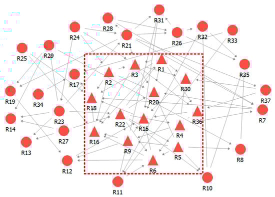 A network visualized through the software can be distinctly displayed and dynamically tracked. Netminer version 4.0 is widely utilized due to its splendid competence in processing and exploring complicated nonlinear networks. Thus, Netminer is applied to visualize PCSRN and uncover the patterns of risk interactions in subsequent work. The network graph is mapped in Figure 4.