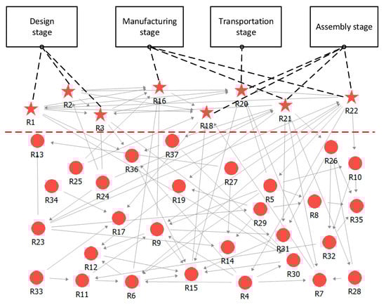 What is obvious from the outcomes is that the top three safety risks in each of the indicator analysis results are partially overlapped and consistent. In fact, almost all the top three nodes of eigenvector centrality, degree difference and HITS also own the maximum K-shell value of 4, which characterizes them as the most influential nodes in PCSRN. Eight risks on aggregate are identified as the critical construction safety risks of prefabricated building projects, including R22 (Inadequate safety education and training), R21 (Poor organizational communication), R1 (Lack of safety considerations in design), R3 (Design variations), R2 (Error in design), R20 (Unsecured equipment/tool/object), R16 (Quality defects of prefabricated components), and R18 (Insufficient connection strength of prefabricated component). These vital nodes are highlighted as star nodes and moved to the upper level of the network diagram, as illustrated in Figure 7. Intuitively, critical safety risks originate from all stages of prefabricated construction. There are four safety risks in the assembly stage, followed by the design stage and manufacturing stage with three safety risks, respectively, and only one critical safety risk belongs to the transportation stage. These critical risks are worth high attention from the project team in view of their striking direct and/or propagating effects on many successors and/or predecessors.