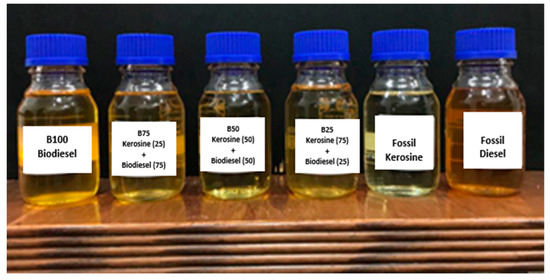 We adopted biodiesel fuel extracted from animal fat organic waste (B20, B50, B75 and B100) blended mixtures with conventional diesel, as well as kerosene (control) aviation fuel for the operation of the fabricated MGT engine. The six proposed six liquid fuels require stringent preconditioning before adoption in GTEs due to their more comprehensive range of hydrocarbons and particulate contents. The physical and chemical properties of each proposed fuel for the operation of the MGT engine were characterized to investigate the engine’s combustions performance [42]. The physical and chemical properties of the fuel must be determined for significant adoption GTE operations [43]. The characterization of these is based on selected factors (specific gravity, density, kinematic viscosity, total acid number, water content, total sulfur, flash point, lubricity, cloud points, and pour points). These were validated in compliance with the American Society for Testing and Materials (ASTM) D6751 standards [44]. The test was conducted at the Petroleum Research Center, Kuwait Institute for Scientific Research. The properties of viscosity, density, and surface tension play a central role in spray combustion. Fuel viscosity affects the power required to pump the fuel through the fuel system, as well as atomization and droplet evaporation. The higher the viscosity of the fuel, the lower the quality of atomization, leading to soot formation and resulting in carbon deposits within the combustion system. Carbon deposits can damage hardware due to high thermal radiation and clogging. Most liquid fuel systems also require separate air atomizing systems during the ignition process, depending on the type of atomizer used in the fuel injection system. The six characterized fuel samples for fabricated MGT testbed engine deployment are displayed in Figure 1.