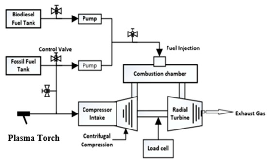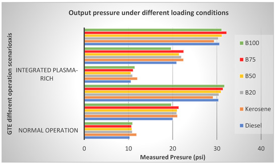 Similarly, after injection of the hybrid plasma-rich fuel mixture (Figure 7), the system was operated at a fixed air-to-fuel ratio of 2:1 and a varied thrust load of 10, 20, and 30 psi in both operational scenarios with and without external integration of the proposed hybrid plasma-rich fuel mixture. The complete fabricate MGT setup was subjected to three different loading conditions (low load, medium load, and maximum loading) and six fuel types (use fossil kerosene; fossil diesel; Kuwaiti sheep fat biodiesel fuel, and different blend ratios between renewable biodiesel fuels and kerosene) and operated under two different operational scenarios: