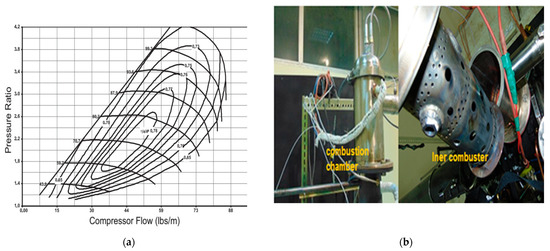 Fabricated GTE (a) compressor map and (b) adapted combustion chamber.