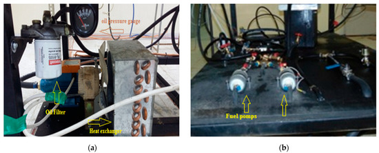 The fabricated parts of the oil system for the MGT engine consist of a 14-L oil tank, a gear oil pump, and a heat exchanger. The fabricated oil system unit comprises an oil filter and a control valve to maintain the system oil pressure at 5 bars for sufficient lubrication of all moving parts. It also serves as a cooling medium, assisting in quick heat dissipation to protect the turbine engine from excessive heating, as displayed in Figure 4a. The oil used in the system is fully synthetic of 5 W-30 grade, in compliance with the Petroleum Quality Institute of America as specified for the smooth operation of turbochargers of any GTE.