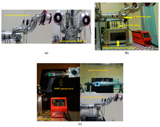 The developed testbed produced plasma from water vapor at a pressure of 1 bar (14.7 psi). The device consists of a 240 volt, 3.5 kW electrical source power unit; the plasma torch was positioned in the front of the fabricated compressor inlet (after many trials) [46] for hydrogen gas reformation. The hydrogen gas reformed at 5000–8000 °C is transmitted into the combustion chamber, as seen in Figure 6c.