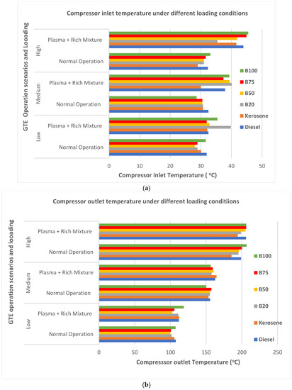 The impact of the external integrated plasma technology on the compressor inlet temperature is reflected in the 10 °C increase recorded across all applied fuels compared with GTE operation under normal conditions, as highlighted in Table 3. The result supports the need for increased temperature of the combustion chamber for the effective performance of the engine. A slight increase in firing temperature significantly impacted the produced horsepower and engine efficiency. Continuous heating is achieved with plasma technology compared with regular GTE operation without plasma technology under the three different loading conditions in Table 4. The increased inlet temperature supports the combustion chamber temperature buildup for effective combustion performance of the engine in order to achieve continued heating. The B20 biofuel blend recorded the highest inlet temperature under low and medium loading, with an increase in loading conditions across all biodiesel blended fuels. Under the external integrated plasma technology, B75 and B100 recorded the highest inlet temperatures at the most elevated loading conditions (Figure 8a). This may be due to the high-temperature characteristics of plasma technology, which influence the spectacular increase in the load. The impact of load increase affected the change in temperature measured at the compressor inlet, as observed for all fuel temperature measurements. The higher the loading, the greater the compressor inlet temperature.