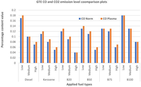 The concentrations across all measured GHG emissions from the fabricated GTE under normal and integrated plasma technology demonstrated the lowest value with the biodiesel fuels. This is due to low values of unburnt hydrocarbon and nitrogen per million liters of applied fuel in the combustion chamber of the GTE. The significant emissions of the MGT are oxygen (O2), carbon monoxide (CO), carbon dioxide (CO2), nitrogen monoxide (NO), and nitrogen dioxide (NO2). The released O2 emissions under plasma-assisted combustion technology do not depend on the fuel type and engine loading. CO is mainly formed through incomplete combustion of fuel within the engine combustion chamber due to insufficient available oxygen. There is variation in CO emissions from different fuels under varying MGT engine loading conditions, with B75 recording 0.07% and 2.8% content values for CO and CO2, respectively, as displayed in Figure 10.