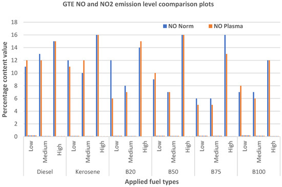 The oxides of nitrogen in the exhaust emissions contain nitrogen monoxide (NO) and nitrogen dioxide (NO2), which are influenced by the fuel’s cylinder pressure, temperature, and oxygen content. The adoption of plasma technology in the fabricated GTE reduced the impact of NO and NO2 on the environment. All of the biodiesel fuels produced a promising lower composition of NO emissions under both low and high loading conditions, as seen in the highlighted cells in Table 7. The B75 biodiesel blended fuel demonstrated the lowest percentage of NO and NO2 content of 5% and 7%, respectively, compared with other applied fuels under three different loading conditions, as displayed in Figure 11. Under integrated plasma technology, the obtained NO from with B75 demonstrated lower values under different loading conditions than fossil diesel.