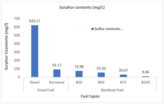 The lower NO composition is observed under integrated hybrid plasma-rich fuel-assisted combustion, which is attributed to the positive impact of the generated hydrogen plasma molecules that increase the combustion temperature and ensure a complete combustion process. This phenomenon raises both the cylinder temperature and the hydrogen flame formation speed, thus reducing NO emissions from the applied biodiesel fuel blends. This supports the previously obtained result of low sulfur contents from the laboratory fuel characterization tests, as shown in Figure 12. These values increase with engine loading conditions. B20 and B75 resulted in the most reduced emissions, with the lowest values for nitrogen oxide (NO) compared with fossil kerosene, fossil diesel, and other biodiesel blends. Minimizing nitrogen oxide emissions will significantly improve the ozone layer. These results show that integrated hybrid plasma-rich fuel-mixture-assisted technology in engine operation with the use of biodiesel fuels results in a lower composition of NO2 compared to diesel and kerosene.