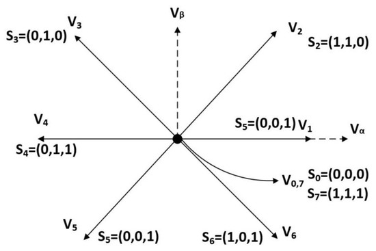 where is the filter inductance and and are the filter current and voltage, respectively. Variable is the inverter voltage of the system, and it has eight different voltage vectors, as shown in Figure 2.