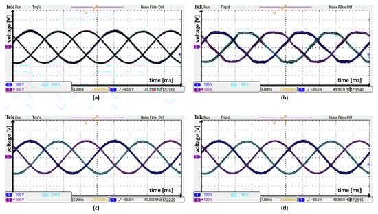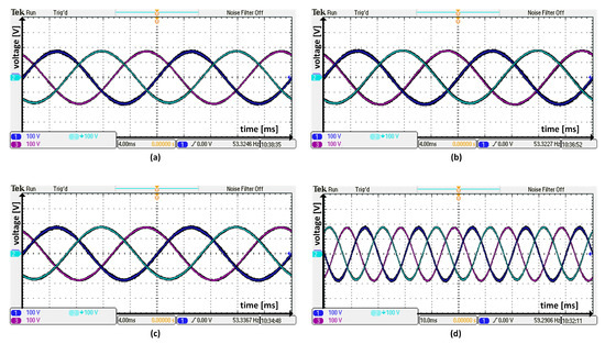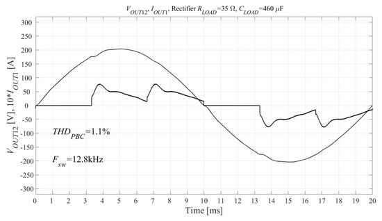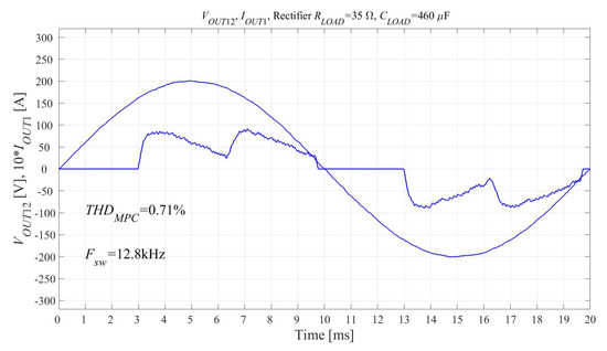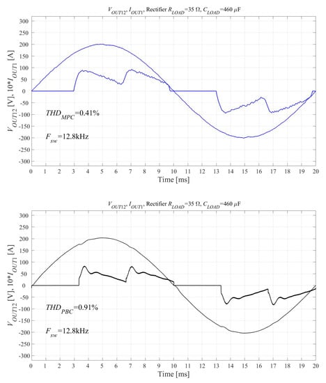 Figure 3, Figure 4, Figure 5 and Figure 6 present the results for the Matlab simulation model output voltages for the nonlinear rectified RC load. The investigations were performed using the load capacitor— F to show the controller behavior for the higher load conditions. The value of the output filter capacitor was intentionally increased based on many papers, especially concerning PBC controllers = 60 F [21,22]. During simulations, the overall behavior of the system was examined, including time responses and delays. The figures show the third period due tuning both the controllers. In case of PBC, one period delay was observed in comparison to the MPC output voltage THD stabilization on some constant level. The simulations parameters are based on [24]; however, the system presented in this paper was tuned to the balanced load with changeable filter parameters to maintain the good output voltage quality. The system must fulfill, in the same time, the necessary stabilization conditions for both the controllers. Almost all the results are oscillating about 1% of the output voltage ; the most harmful was decreasing the output filter coil.