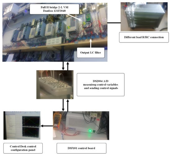 Typical modern feedback or predictive controllers are single-input single-output (SISO) or multiple-input single-output (MISO) controllers [1,2]. In case of the MISO controller in DC/AC converter, an application system analyzes three main input variables [3,4]. Those are output voltage—, output current—, and filter current—. On the other hand, the simplest SISO control method is based only on the output voltage. The main advantage of application of the MISO controller is the effective control functionality and reducing output voltage [5,6]. Moreover, we should observe a faster outcome of the steady state and lower voltage overshoot for the dynamic load type in comparison with the SISO control mode.