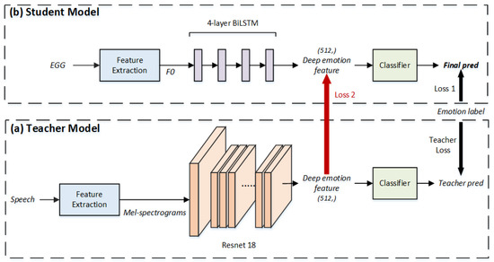 Cross-modal distillation aims to improve model performance by transferring supervision and knowledge from different modalities. It normally adopts a teacher-student learning mechanism, where the teacher model is usually pre-trained on one modality and then guides the student model on another modality to obtain a similar distribution. The distillation methods usually involve the traditional response-level knowledge distillation [32,33,34], which uses the logits as the supervision, and feature-level distillation [35,36], which encourages the student network to learn and imitate the intermediate representations of the teacher network. For the speech emotion recognition task, in 2018, Albanie et al. [37] proposed a method of training a speech emotion recognition model with unlabeled speech data via response-level distillation from a pre-trained facial emotion recognition model given visual-audio pairs. Li et al. [38] proposed a method of training the speech emotion recognition model without any labeled speech emotion data with the help of emotion knowledge from a pre-trained text emotion model. These studies apply cross-modal distillation to speech emotion recognition, which inspired our study. However, it must be highlighted that our paper aims to extract emotion information from EGG signals, not speech itself, which is a fundamental difference compared to the above research.