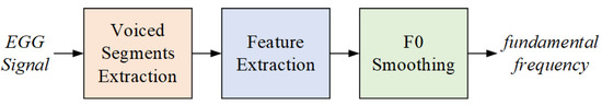 The student model was based on only EGG signals and was composed of three stages as well. The fundamental frequency () is a commonly-used excitation feature to characterize vocal cord vibration. The fundamental frequency intensity and duration help in the analysis of prosody factors according to Rao et al. [41]. Thus, we chose the fundamental frequency () as the input of our student speech emotion recognition model. The extraction of from EGG signals was based on [42], as shown in Figure 3.