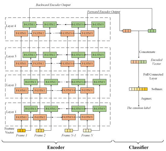 When considering the emotion feature encoder, as the fundamental frequency is a 1D acoustic feature with strong temporal correlation, we selected Bi-LSTM (bidirectionally long short-term memory) as the feature encoder for its superior performance in sequence processing and previous speech emotion recognition tasks. After the comparison of different depths of the layer, we finally adopted a 4-layer Bi-LSTM with a fully connected layer as the student speech emotion recognition model, illustrated in Figure 4. Each bidirectionally LSTM contains 512 bidirectional LSTM cells (256 forward nodes and 256 backward nodes) and finally generates a deep emotion feature vector with a length of 512. The dimension of the student feature was restricted the same as the teacher’s feature output to learn the distribution of the teacher’s features via cross-modal emotion distillation.