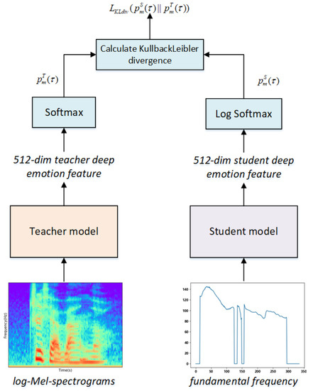 where S is the vector of thhe student’s deep emotion features, and T represents the teacher’s. is a hyper-parameter; in our work, we set according to the results of the comparative experiment. is the vector of the student’s emotion features after log softmax with the hyper-parameter at the point m. Finally, is the teacher’s vector after softmax with the hyper-parameter at the point m. Equation (4) gives the formulation of Kullback–Leibler divergence.