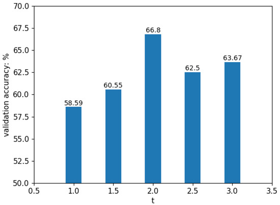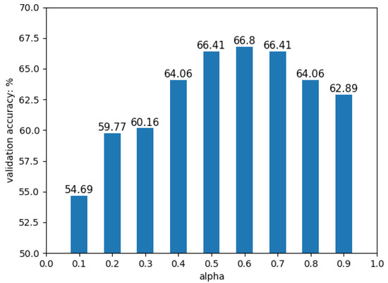 To further discover the influence of cross-modal emotion distillation on the results on the condition of , we modified the hyper-parameter of , which indicates the proportion of the distillation loss in total loss. Figure 7 indicates that the implementation of cross-modal emotion distillation obviously improves the performance of the model. From to 0.9, the accuracy of the validation dataset increased to varying degrees. The highest validation accuracy was reached when , then dropped slowly with the proportion of the categorical cross entropy that was declining. According to the experiment results, we set .