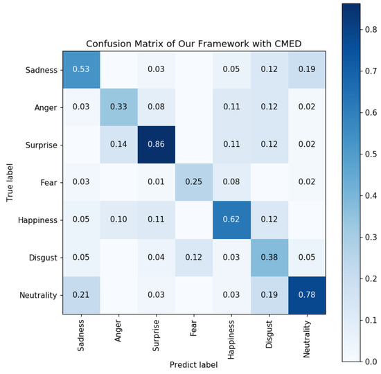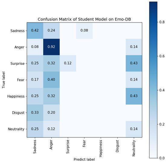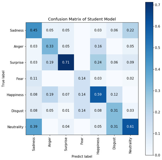 Figure 12 and Figure 13 show the confusion matrix of our student model and model with CMED. It clearly can be seen that depending on only the student model with a lack of training data and the information of the sound track, we can hardly obtain the emotion information. The output of the student model tends to focus on just part of labels and loses the attention of the others. In contrast, adopting CMED greatly ameliorates this phenomenon. With the aid of CMED, the model can be aware of all the emotions and classify them. Although the result still has room to be improved, it has achieved a great improvement compared with the student model.