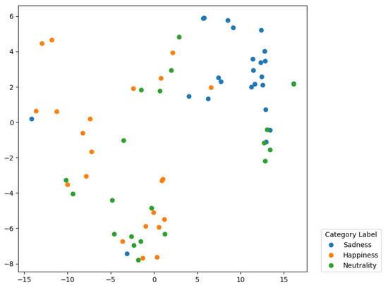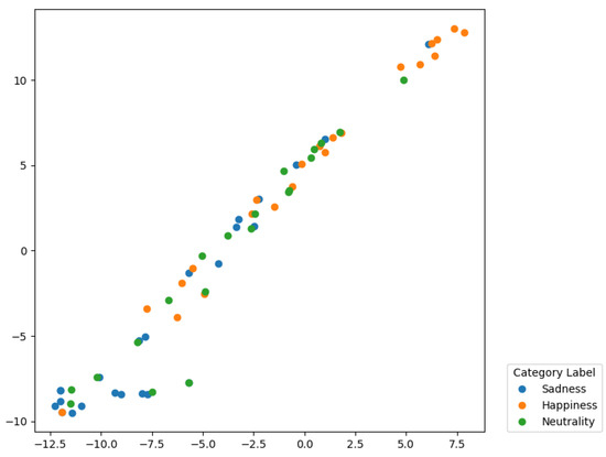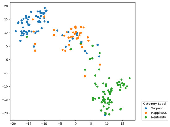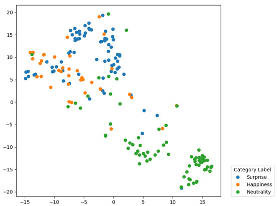 To further discover the distribution of our 512-dimension deep emotion feature in the emotion feature map, we visualized the feature of the 4-layer Bi-LSTM output using the t-SNE technique [54], which carries out a feature dimension reduction from the original dimension to two-dimensional space. To clearly visualize the distribution, we selected three emotions which are difficult to classify: surprise, happiness and neutrality. Figure 10 and Figure 11 illustrate the distributions of the deep emotion features of the student model and the proposed model with CMED, respectively. The horizontal and vertical axes indicate the x and y axes in two-dimensional space.