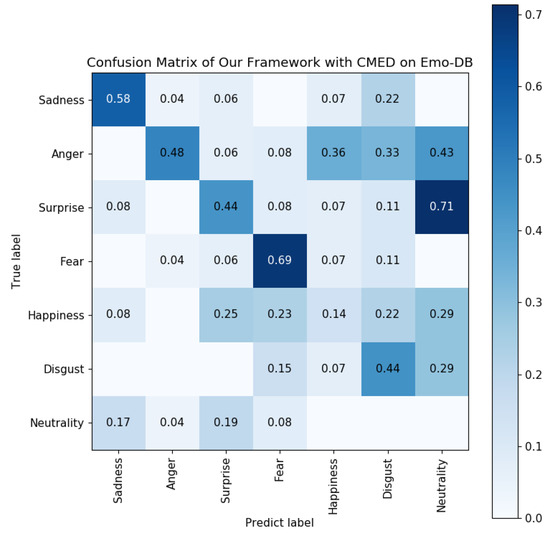 In this section, we will further evaluate and discuss the results of our framework, especially from the aspect of the different performance between different kinds of emotions. Figure 8 and Figure 9 show the confusion matrix of our student model and the model with CMED, respectively. The horizontal axis is our predicted emotion label and the vertical axis is the true label. Through the contrast of these two confusion matrices, we can find that the validation accuracy of almost every emotion has been consistently improved with the aid of cross-modal emotion distillation. To be specific, for anger, happiness, and neutrality, the validation accuracy has been improved by 15%, 3%, and 17%, respectively, which reflects the superiority of CMED in improving the performance of SER when enough utterances can be acquired. For the emotions that lack utterances, such as fear and disgust, the performance can also be improved by 11% and 7%. Better performance on these types of emotions indicates that with CMED, the ability to distinguish emotions has been improved significantly, regardless of the lack of utterances.