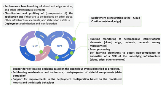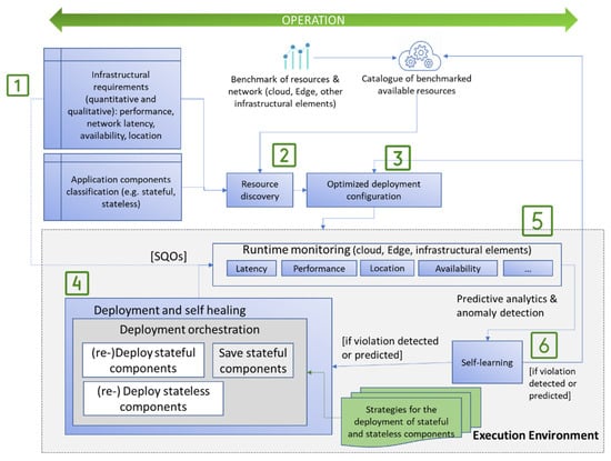The combination of such technologies implies that the DevOps teams need to have a deep knowledge of the underlying techniques and technologies and need to be able to work with several of them, seamlessly integrated. These kinds of heterogeneous computing environments pose complex tasks for the operationalization of the applications by the DevOps teams as they must configure, plan, prepare and execute them. When applying it to dynamic, changeable execution environments where the applications need to be reconfigured under real time tight requirements, this process needs to be short, repeatable and (semi-)automatic. Application operators need to: (1) have real time updated information on the network conditions, computing resources available and data infrastructures and services requirements and (2) be able to seamlessly and transparently adapt the deployment configurations of the applications to respond to the execution environment situation. In effect, applications’ operators need to seamlessly select, combine, configure and adapt computation resources all along the data path and support the complete service lifecycle, covering: (1) distributed application deployment over heterogenous computing resources; (2) monitoring of execution platforms in real-time; (3) application deployment and adaptation while optimizing the execution and (4) application of self-healing to avoid compromising situations that may lead to an unexpected failure.