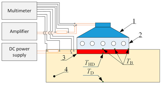 The heater plate was powered with a GW INSTEK PSB-1400 direct current power supply. A Keithley 2700 multimeter was used for the measurements of the voltage and current that supplied the heater. The accuracy of the DC voltage measurement was ±0.05%, and the accuracy of the DC current measurement was ±0.1%.