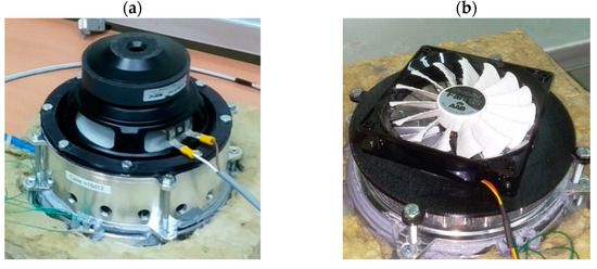Three different cases of heat sink cooling were investigated: natural convection (passive method), active cooling with SJA when the heat sink was located inside the actuator cavity (Figure 3a) and active cooling with the fan (Figure 3b). Data on the heat transfer characteristics with the SJ at the resonant frequency was taken from [27,28] for the actuator with 16 orifices of a diameter of 10 mm each. The results included data for two different loudspeakers: W.18.200.8.FGX [27] and W.18.180.8.FCX_v2 [28]. In the present work, these actuators are referred to as “SJ (Gil et al. [27])” and “SJ (Gil and Wilk [28])”, respectively.