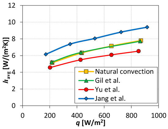 The average heat transfer coefficient as a function of the heater’s heat flux q. Data from: Gil et al. [27], Yu et al. [15], Jang et al. [14].