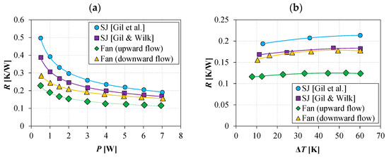 The thermal resistance of the heat sink as a function of (a) the power supplied to the cooling device; (b) temperature difference at the power of W. Data from: Gil et al. [27], Gil and Wilk [28].