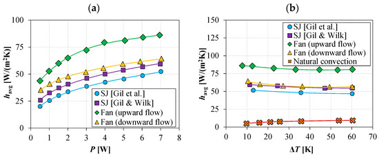 Figure 7 presents the thermal power dissipated by the heat sink for natural and forced convection as a function of the temperature difference. All the results presented in Figure 7 were recorded at the power of W supplied to SJA/fan. As expected, the lowest value of the dissipated thermal power occurred in the case of natural convection and was much higher for the active cooling methods. The highest value was measured in the case of the fan “upward flow” configuration. In the cases of fan “downward flow” and SJ (Gil and Wilk [28]), the values of dissipated thermal power were similar. With the increasing heat sink base temperature Tb at constant ambient temperature T∞, the dissipated thermal power for active cooling methods increased almost linearly. For the input power of P = 7.0 W, the fan-cooled (upward flow) heat sink under a temperature difference of ΔT = 60 K dissipated the thermal power of . For the same input power and temperature difference, the heat sink cooled with synthetic jet dissipated the thermal power of , while under natural convection, it dissipated the thermal power of (Figure 7). Thus, the heat transfer enhancement with fan cooling relative to natural convection is equal to 8.5, while the enhancement with synthetic jet cooling relative to natural convection is equal to 6.0.