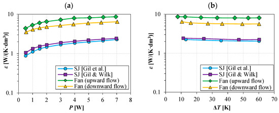 The heat transfer rate of the heat sink per unit temperature difference and unit volume of the cooling device ε as a function of (a) the power supplied to the cooling device; (b) temperature difference at the power of W. Data from: Gil et al. [27], Gil and Wilk [28].
