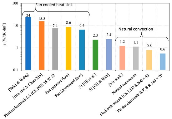 The ratio is useful mainly for the comparison of different types and arrangements of cooling devices. Therefore, in Figure 11, such a comparison in terms of ε is presented. Only the devices that use air as a working fluid are included. The following cooling systems have been selected for comparison: